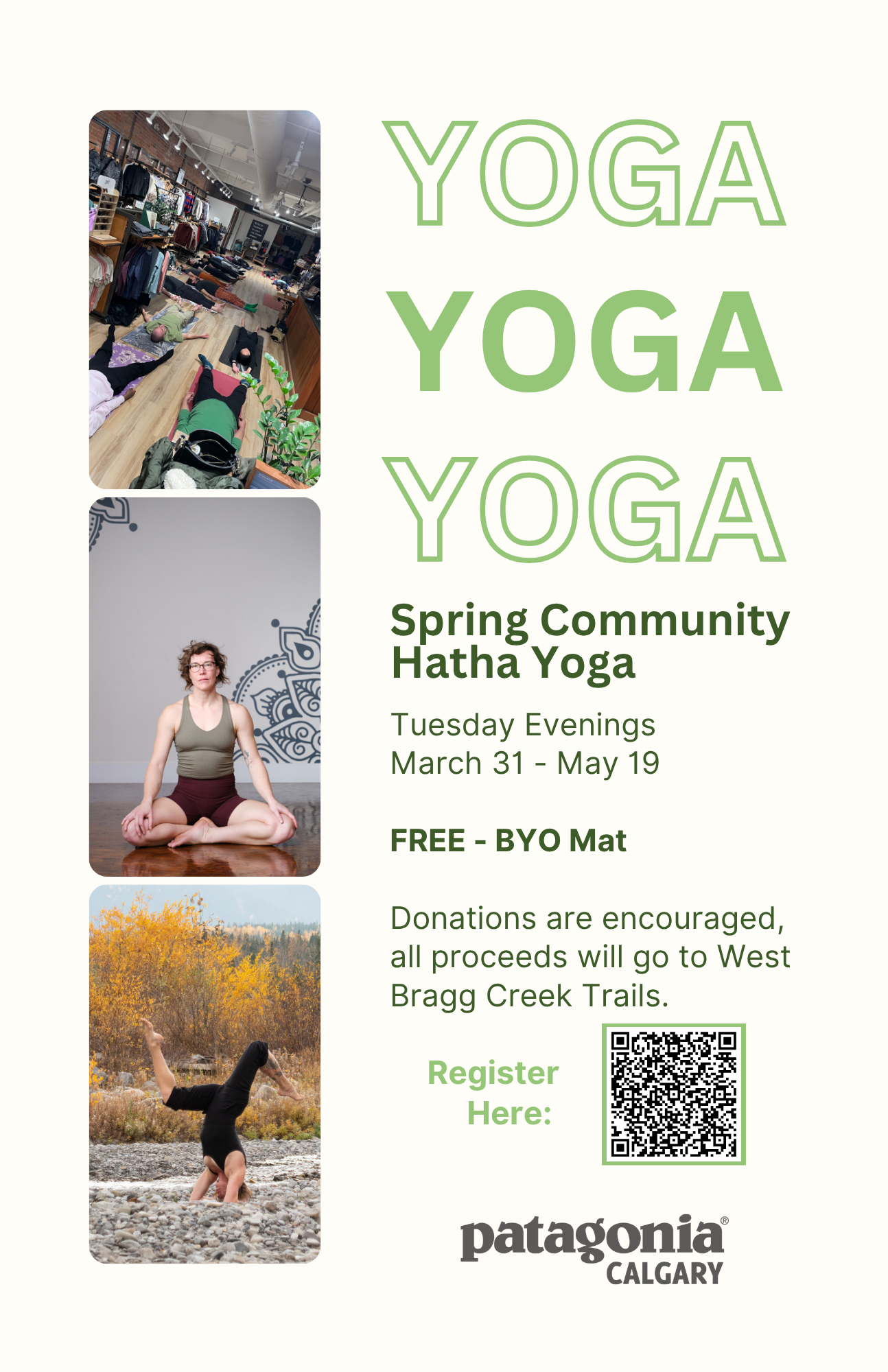 Join me at Patagonia Calgary downtown for an 8 week series of FREE donation based Hatha Yoga practices! 7pm every week for a 60min practice, register by clicking the link on this poster. Donation proceeds are forwarded to a non-for-profit organization of my choice, this spring I’ve chosen our beloved West Bragg Creek trails!